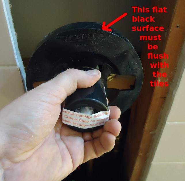 5. Replace the single-handle shower valve's depth guide. Repair or install the shower's wall board and tile. Cut the tile tight to the depth guide. This ensures the valve's trim package covers the opening in the wall tile. Grout and clean the shower walls.